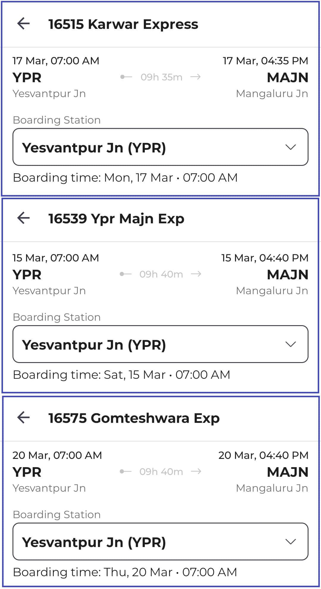 - Enter Journey Details: Select your source as Yesvantpur (YPR) and destination as Mangaluru Junction (MAJN).
